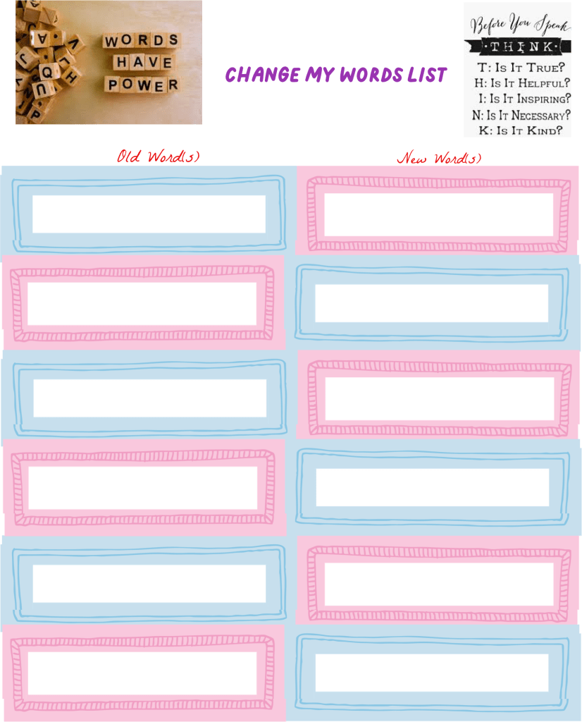 By challenging the words we use, we can take the power out of all the negative thoughts we use on ourself. This is not an easy thing to do. It takes time along with many trials and errors. My suggestion is to make a list of words that contain negative judgements against ourself. Next put another word(s) next to it that is a kinder, gentler word(s) or phrase we could use in its place. If you are unable to think of a new word(s) ask your support team, either professional or friends and family, who can come up with ideas. There is a Change My Words template under the template section. Feel free to use it or to just use it as ideas for making your own. Use a spiral notebook to do this is you aren’t feeling creative.